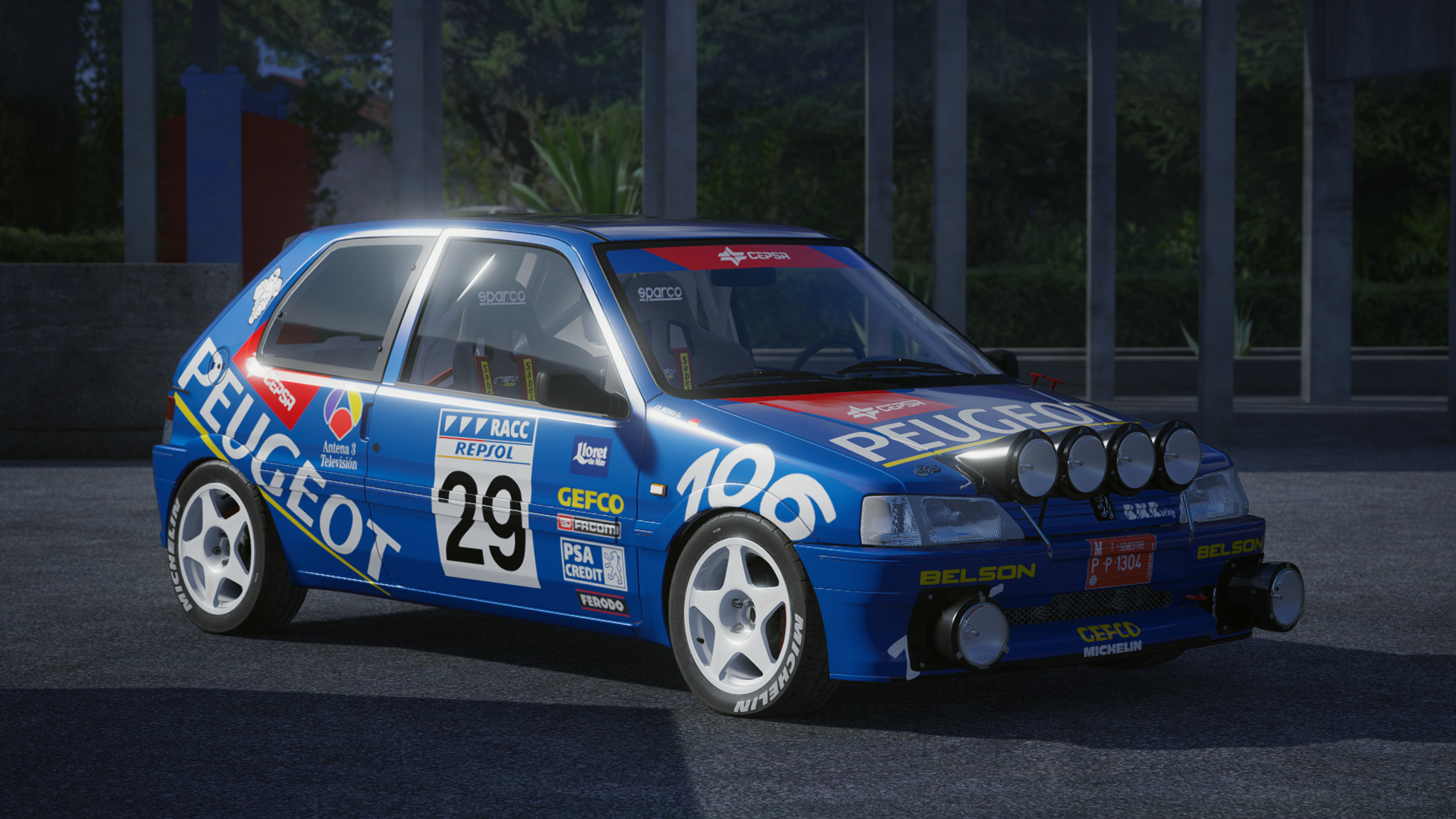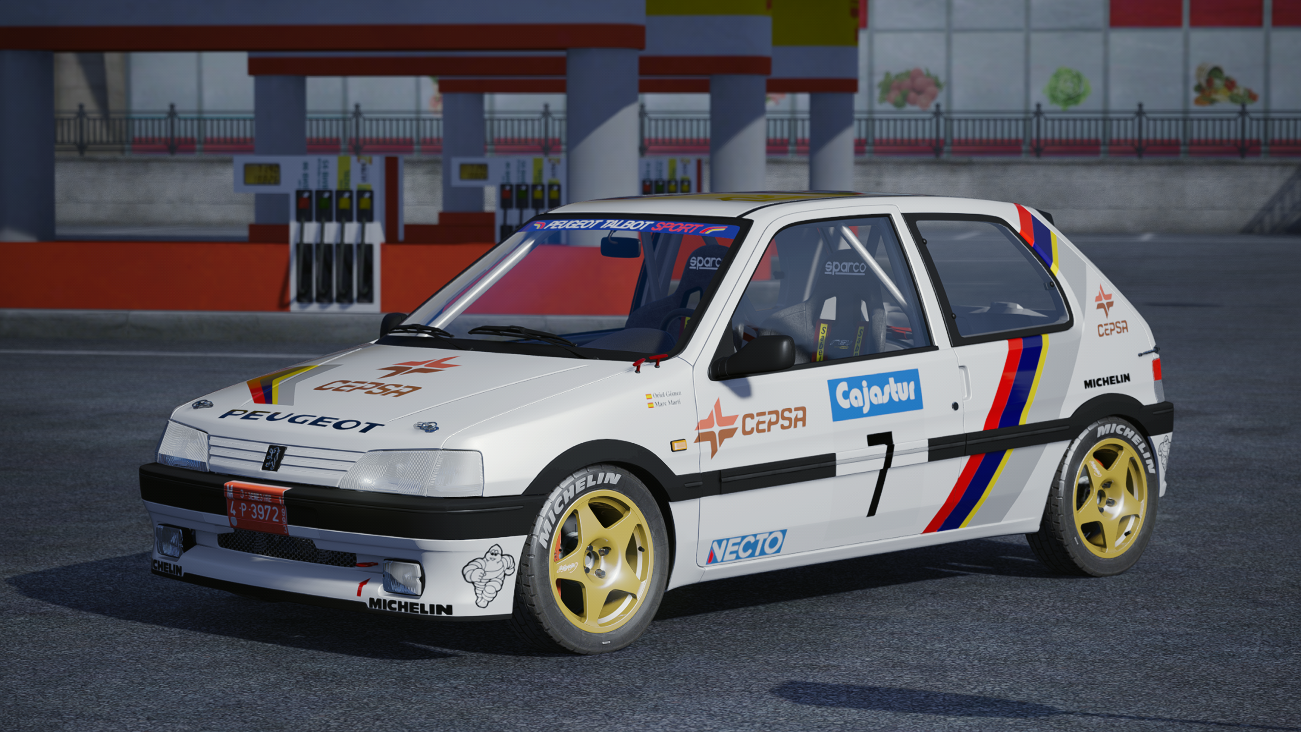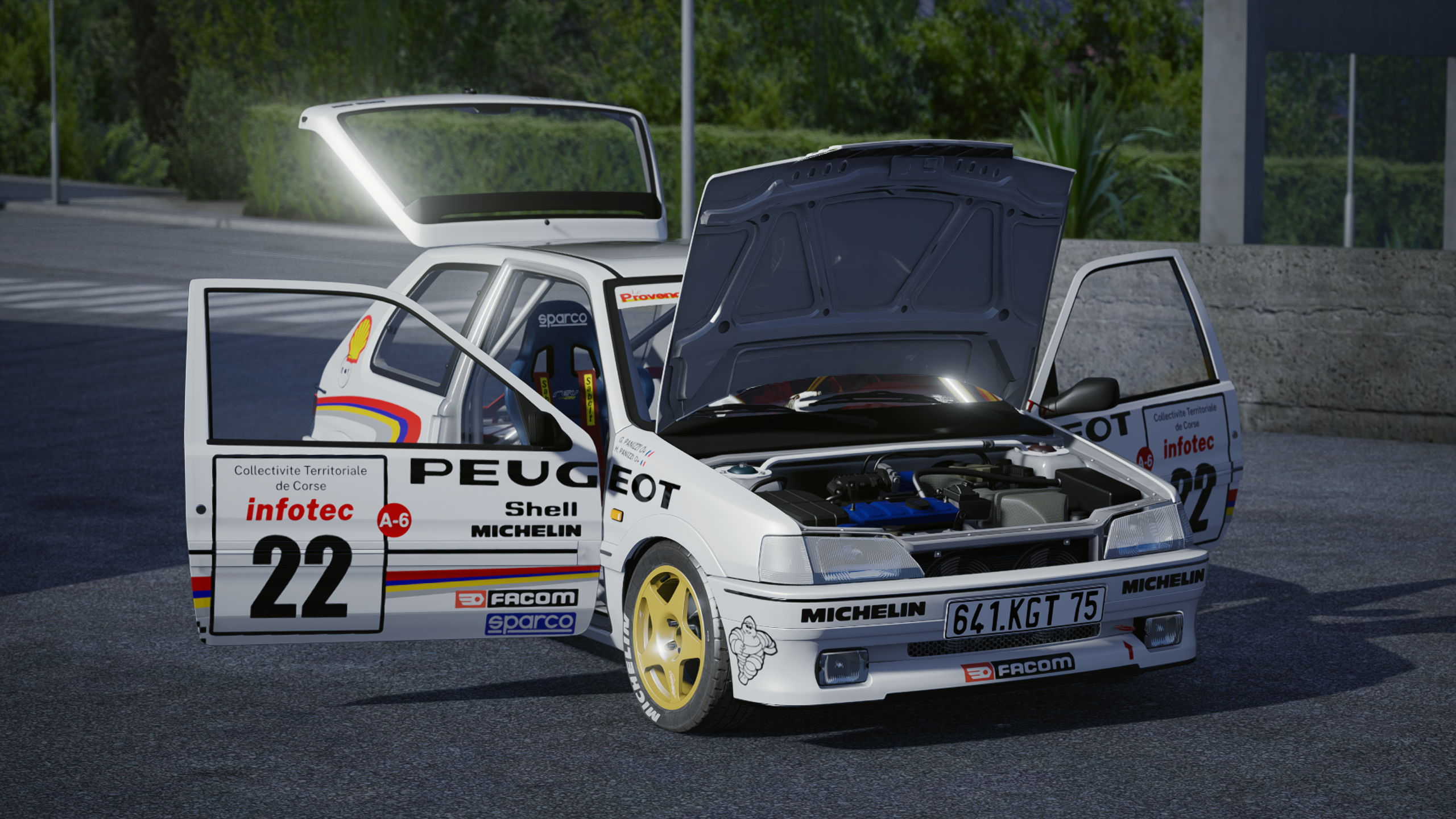 El Remake del Peugeot 106 XSi 1.4 8v Grupo A recrea fielmente el modelo oficial de Peugeot Sport, incluyendo especificaciones FIA y detalles basados en la unidad utilizada por Gilles Panizzi. Destaca especialmente por la incorporación de una caja de cambios de crabots, poco habitual en Assetto Corsa, que aporta una experiencia de conducción más directa, mecánica y exigente. Se trata de una versión muy enfocada a la fidelidad histórica y técnica, pensada para quienes buscan una recreación precisa de los primeros Grupo A de tracción delantera. Versión 1.0 (Requiere última versión de CSP) Incluye: - 4 Skins personalizadas - 5 Colores - Animaciones del capó, maletero y puertas (Funcionales In-Game) - Vano motor + Motor KFZ 1.4 8v Gr. A + Bajos modelados - Vibraciones del motor y escape al acelerar - Parrilla de faros y cuneteros instalables desde Setup In-Game (Aleron 0 -> Parrilla de faros, Aleron 1 -> Cuneteros) - Luces de parrilla de faros y cuneteros independientes (Extra Option A -> Parrilla de faros, & Extra Option B -> Cuneteros) - Copiloto activable desde ext_config.ini - Limpiaparabrisas funcionales - Sonido real del motor, samples extraídos del coche real - Materiales PBR - Refractions - Custom emissives